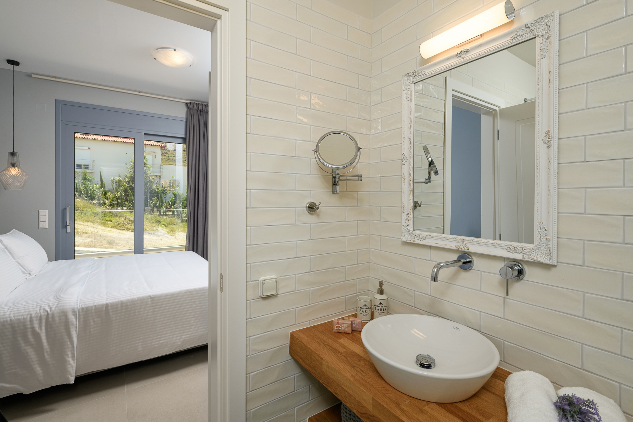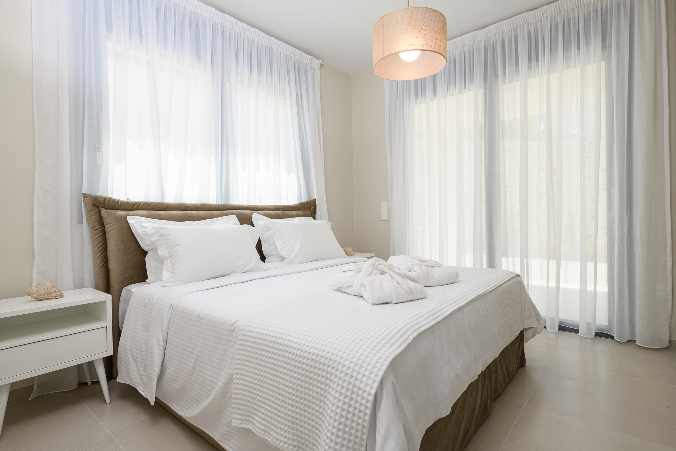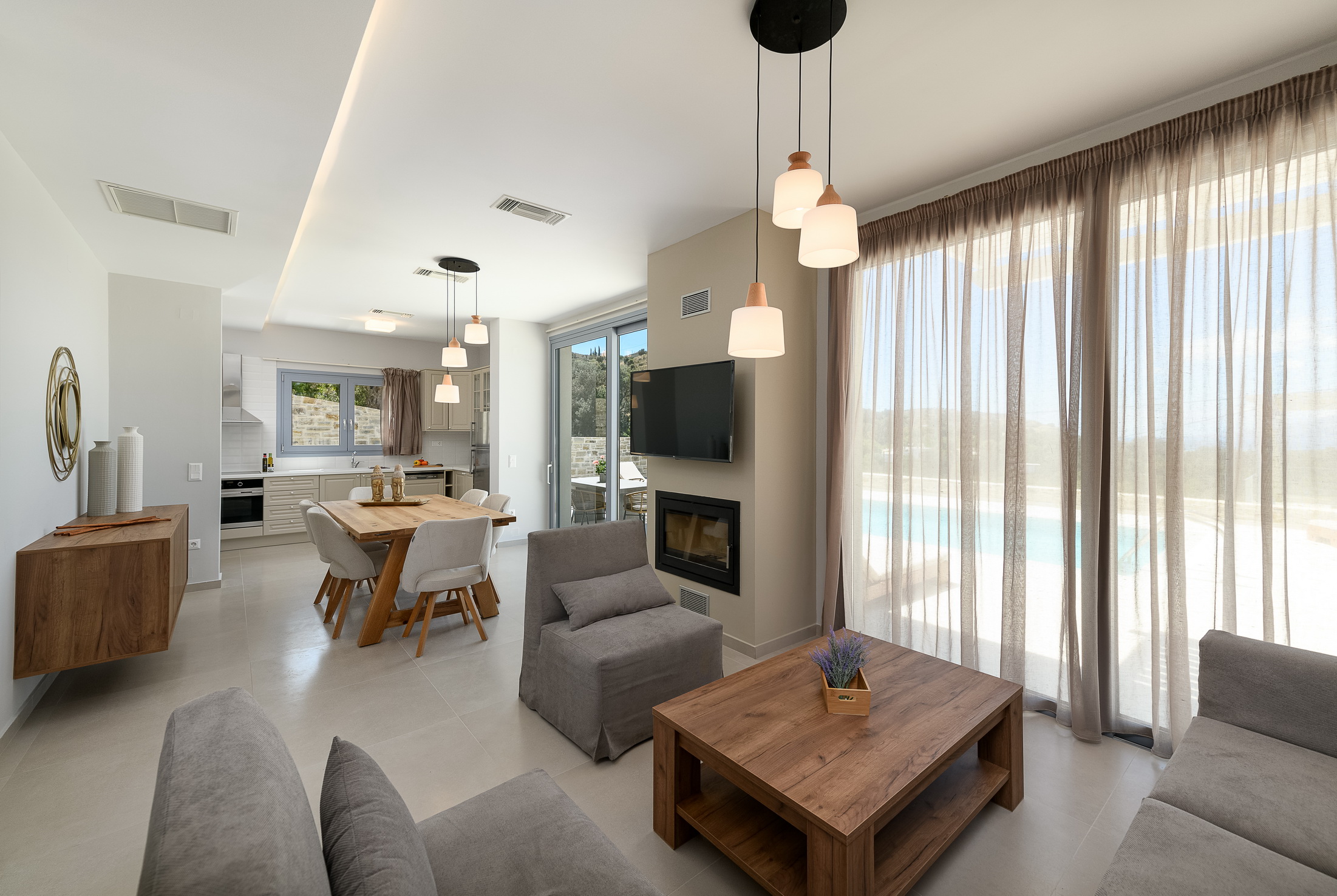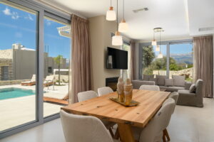 The villa features two spacious bedrooms, two modern bathrooms, and a large, fully equipped kitchen. The cozy living room with a fireplace provides the perfect setting to unwind and feel at home, any time of the year.