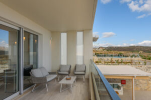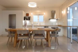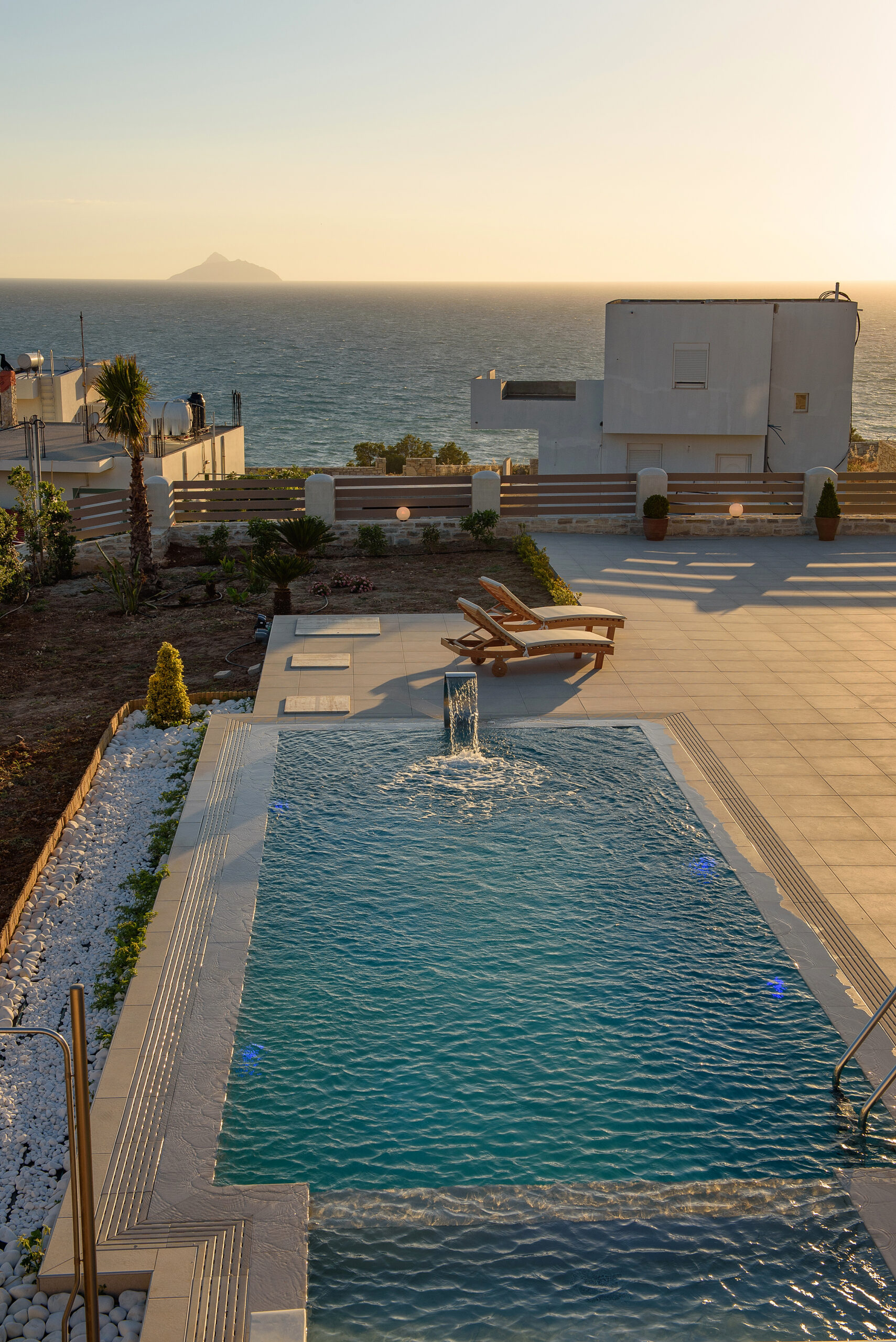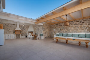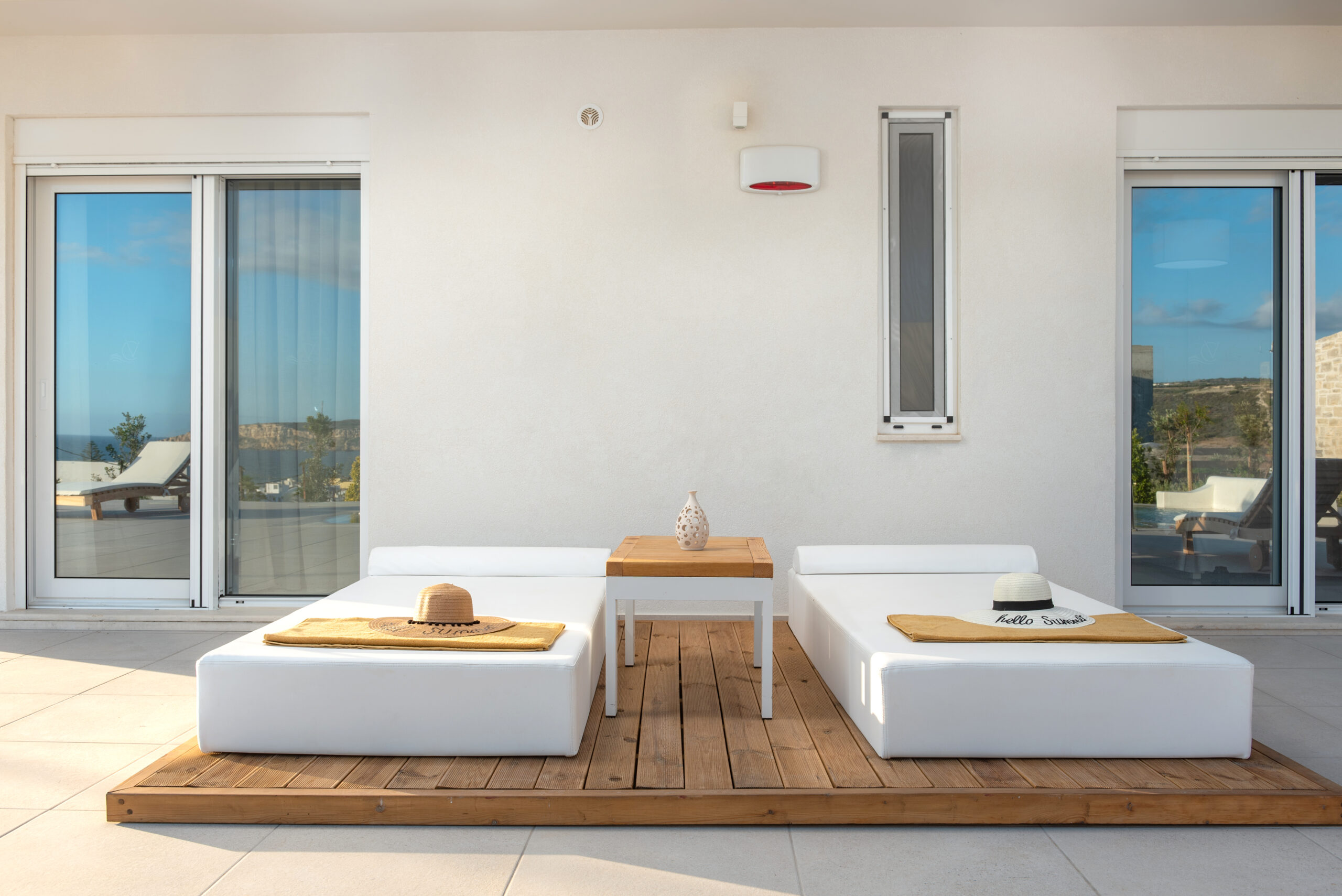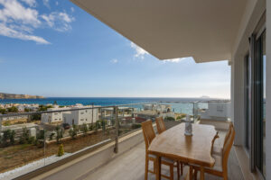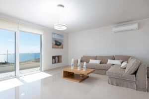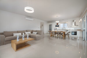 The modern Villa Delfini 4 is for 4 – 6 people, 145 m² living space located near the sea away from the village in a quiet location leaning against a dune, overlooking the small town of Kalamaki and the Bay of Kalamaki, the Libyan Sea, 150 meters away from the Beach and the sea. The private property is surrounded by a stone wall, it is comfortable, tasteful and uniquely decorated. The furniture is luxurious and is equipped with the latest “Smart Home Electronic. Large panoramic windows give a spectacular view of the Libyan Sea and the Paximadi Islands. If you are a nature lover and look for peace and quiet, this modern Villa is the perfect choice for you.