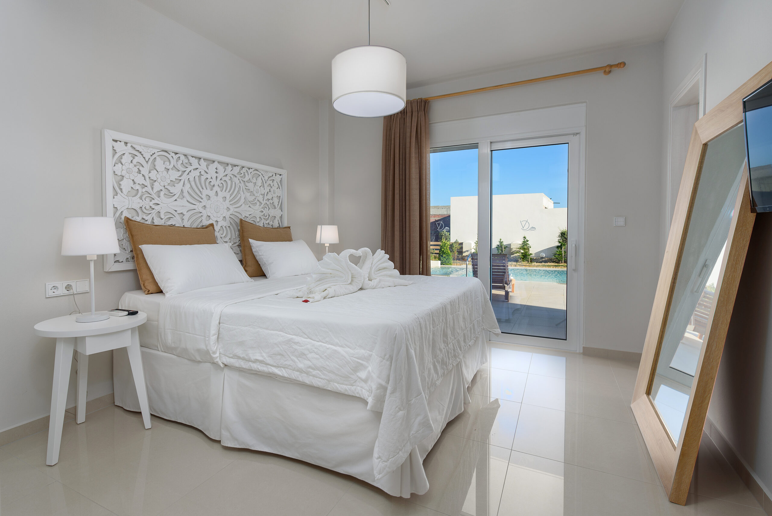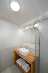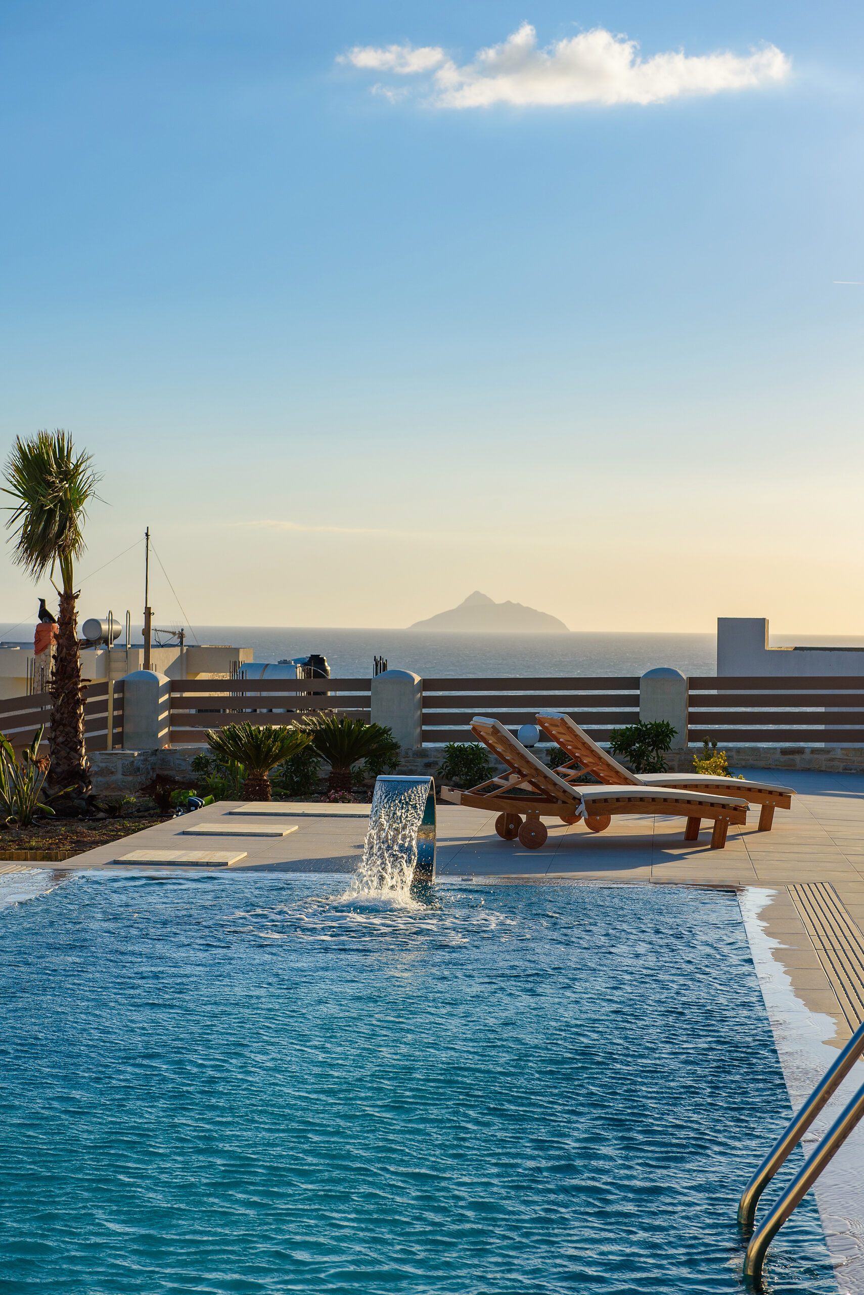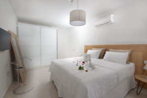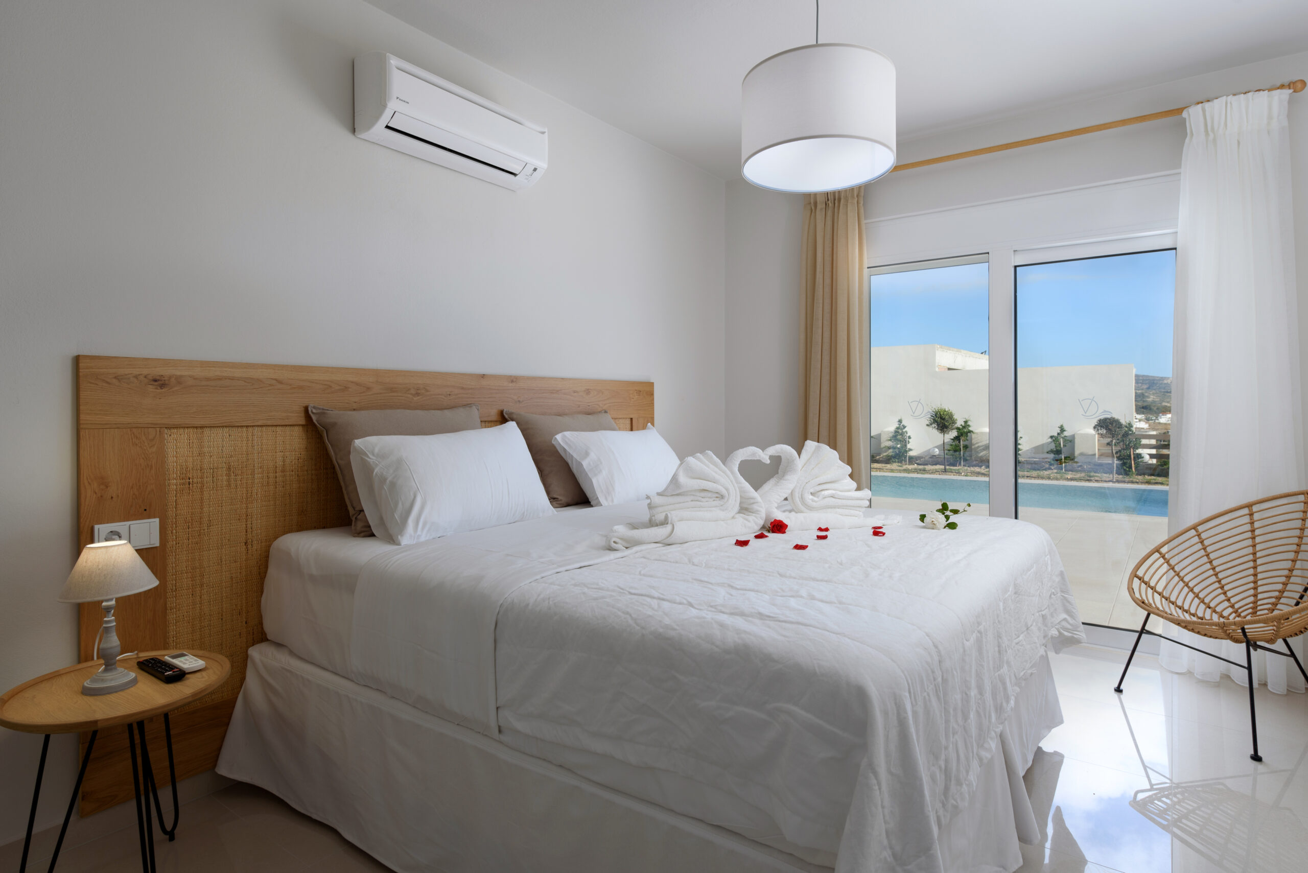 The modern Villa Delfini 4 is for 4 – 6 people, 145 m² living space located near the sea away from the village in a quiet location leaning against a dune, overlooking the small town of Kalamaki and the Bay of Kalamaki, the Libyan Sea, 150 meters away from the Beach and the sea. The private property is surrounded by a stone wall, it is comfortable, tasteful and uniquely decorated. The furniture is luxurious and is equipped with the latest “Smart Home Electronic. Large panoramic windows give a spectacular view of the Libyan Sea and the Paximadi Islands. If you are a nature lover and look for peace and quiet, this modern Villa is the perfect choice for you.