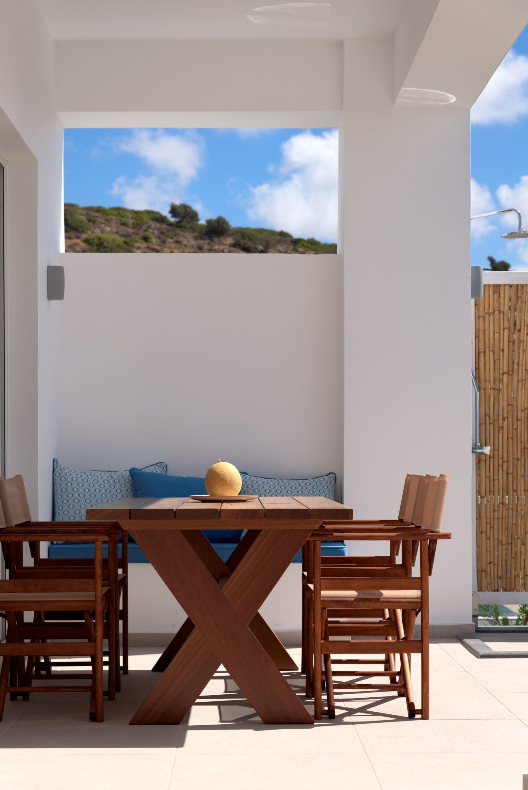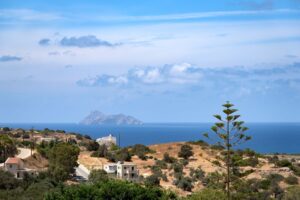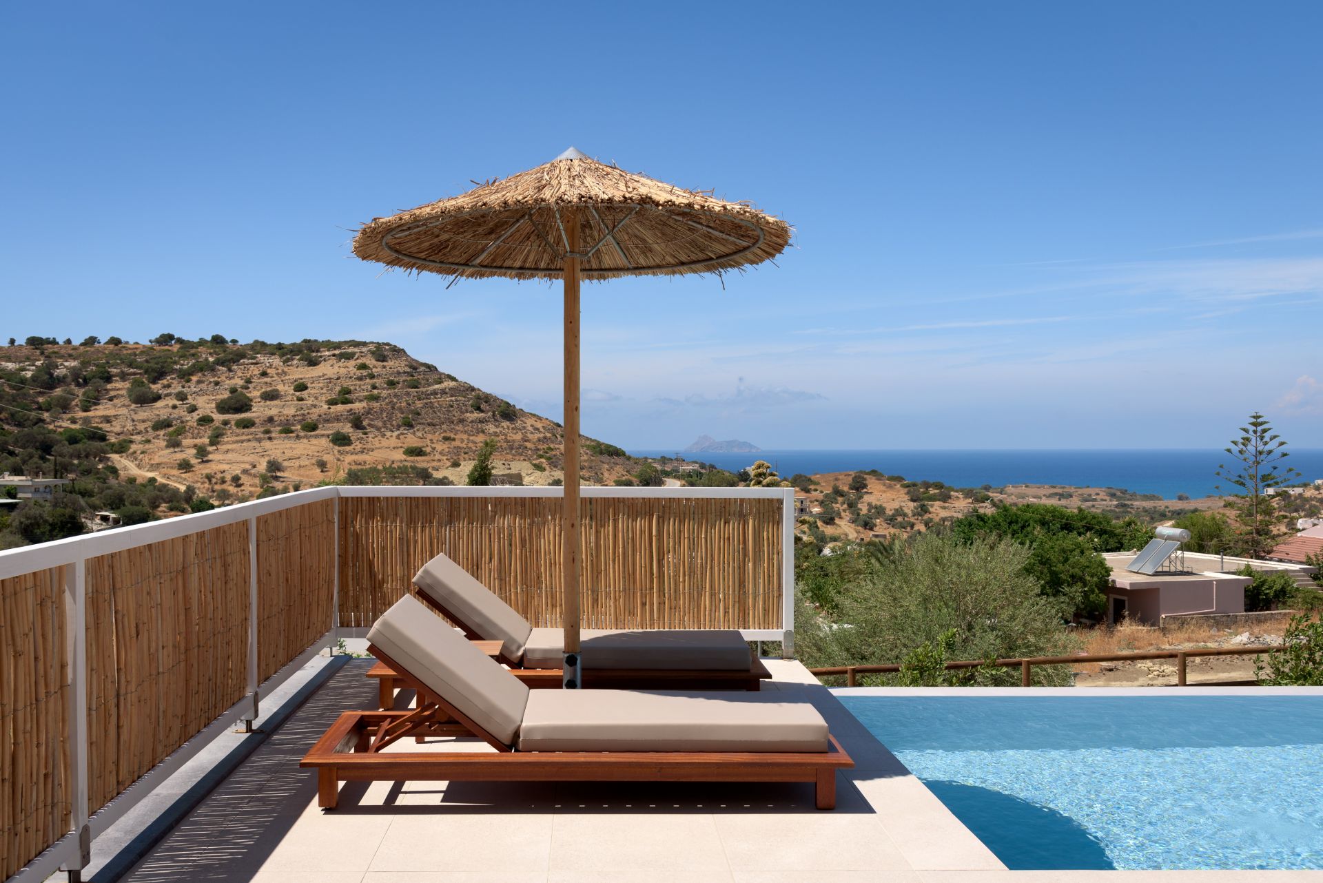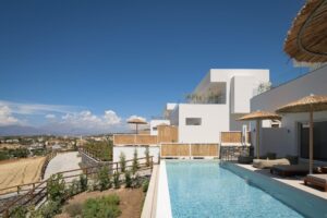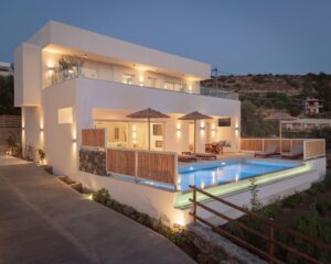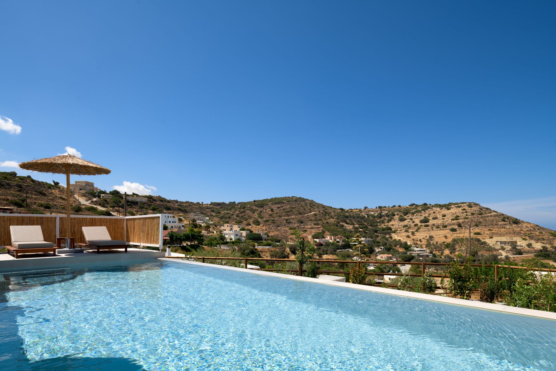 Villa Kalliopi offers magnificent views of Kommos beach, Mount Psiloritis and the traditional settlement of the area, for you to enjoy while relaxing by the pool and in the exquisitely designed outdoor areas. It is 156sq.m., built in 2 levels with excellent quality materials. On the ground floor there is a fully equipped kitchen, a dining room, a bar and a separate bedroom with a double bed and a bathroom with shower. You can enjoy the beautiful view together with an atmospheric fireplace and satellite TV in the living room. On the first floor there are two bedrooms, a bathroom with shower, a bathroom with bathtub and a large terrace with unlimited views. The private pool with dimensions 9m x 3.90m and a depth of 1.40m is ideal for endless moments of relaxation, sunbathing and contact with nature. It also features umbrellas, loungers, bath towels and a beautiful garden with traditional Cretan herbs. The villa also offers private parking.
